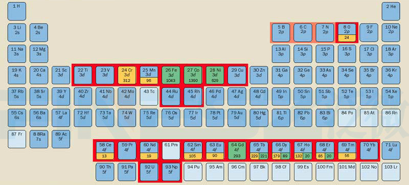 少部分金属并不具备完全填充的电子层结构,以铁为例:常温下铁原子有26个电子,其中24个电子成对填充在原子核外壳层中,处于最外层的2个电子自旋方向并不成对。可以粗暴的比方为,一个班上本来大家都是男生女生一对对的,边上却多了两个光棍。在外磁场的作用下,就这俩光棍自旋方向开始定向,产生微小磁矩,众多磁微小矩的集合在宏观表现为可观察到的磁性,这类金属有铁、钴、镍,以及见元素周期表中的绿色部分。