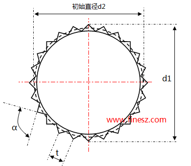 滚花前工件的初始直径 d 2 必须小于公称直径 d 1 ,因为压花纹过程中,材料移位会使初始直径增大。