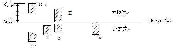 (二)、公制螺纹,外螺纹有三种螺纹等级:4h、6h和6g,内螺纹有三种螺纹等级:5H、6 H、7H。(日标螺纹精度等级分为I、II、III三级,通常状况下为II级)在公制螺纹中,H和h的基本偏差为零。G的基本偏差为正值,e、f和g的基本偏差为负值。如图所示: