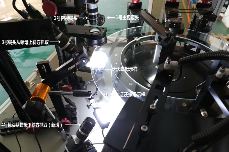 原来只需要在原有3组摄像头基上再加一组摄像头,且从玻璃盘的下斜方进行拍摄,即可保证螺母上下两端螺纹都检测到(之前标配本身已有一组摄像头从玻璃盘上斜方进行拍摄),当然条件是每额外增加一组摄像头成本1万元。