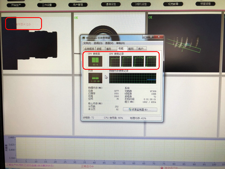 后发现在高强度(同时包含这些条件:4摄像头同时工作;多参数检测;送料速度超500PCS/分钟;较大规格产品)工作条件下,机器显示“队列储存图片过多”,不能识别的产品被回收,这无疑降低了工作效率。初步分析是电脑CPU性能不能满足超负荷计算。如下图: