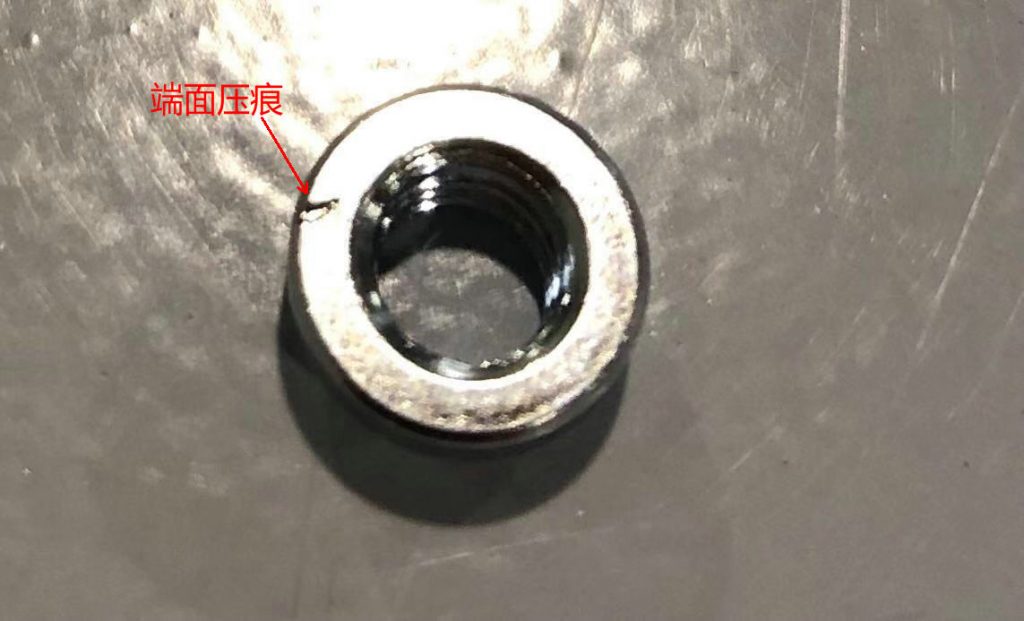 今天发现一批次压铆螺母因生产原因导致端面压痕严重,如下图