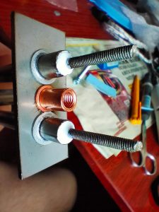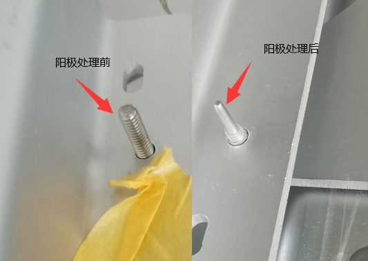 ————理论上是可以的。这里需要提醒的是,我发现在某些特定条件下,不锈钢压铆螺母(或不锈钢压铆螺钉、螺柱等)安装在铝板后进行整体阳极氧化的过程中,不锈钢螺母被电解,以致于螺母本身“瘦”了一圈,这种情况会被误认为螺母腐蚀而事实上是不锈钢螺母被充当阳极板的作用。如图所示。我并不是很清楚在什么什么参数条件下会发生这种现象,故只是提醒。