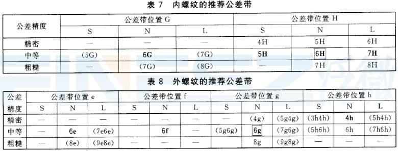表7的内螺纹公差带能与表8的外螺纹公差带形成任意组合但是,为了保证内、外螺纹间有足够的螺纹接触高度,推荐完工后的螺纹零件宜优先组成H/g、H/h或G/h配合。对公称直径小于和等于1.4mm的螺纹,应选用5H/6h、4H/6h或更精密的配合。