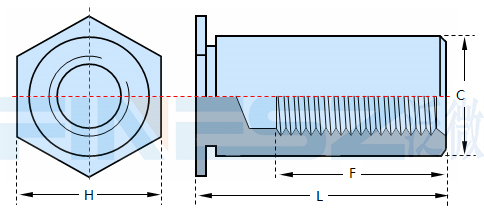 常规的标准的BSO压铆螺柱内螺纹是圆柱端,有时候用户将内螺纹置于六角这一端,如左图所示:圆柱面为盲孔,而六角面为螺纹。