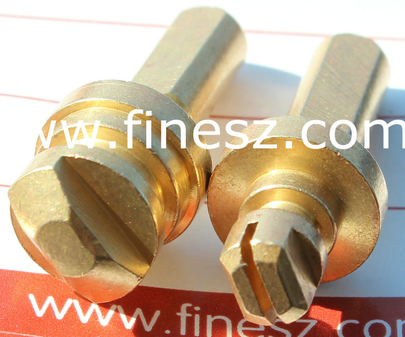 左图为一款车削加工铜芯,应用于阀门,材质C3604快削钢黄铜,跟据客户要求订制的铜车削件作为阀杆阀芯.应用于国际知名品牌的阀门.自动车成型,头部铣边与杆部铣边呈60度转角.头部开槽.外径12.7mm,总长70mm.该铜精密车削件多次应用到成型刀加工.解决了内槽R角及倒角的精度最初采有数车床加工,为节省成本改用自动车床加工。