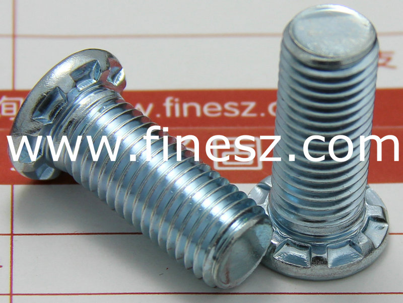 压铆螺钉,其描述方式为FH,不锈钢的压铆螺钉型式为FHS,材质为SUS304。压铆螺钉应于机箱机箱钣金类的薄钣,安装简单方便。在薄板上预冲一个铆压孔(孔尺寸参考下面的技术资料),将压铆螺钉插入孔内,利用冲床或压铆机施力平压头部,压铆螺钉的齿会冷嵌压入薄板内,从而形成一个牢固的螺纹连接副且永久固定在薄板上。