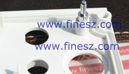 应用于注塑的销,注塑于塑胶后顶针露出于外面,压花部分的台阶埋置于塑里面,露出塑胶的部分只有其细杆部分,其粗杆部分(含压花部分)埋入了塑胶
