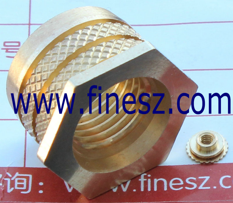 位于左图下面的热压式铜镶件螺母含有网纹及直纹,外圆呈锥形,在热压的过程中以利于顺利导入塑胶孔内.